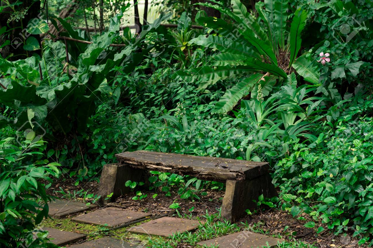 Wood Bench Besieges With Cool Green Plants In Public Park