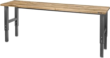 With 15 different height levels this workbench is always the perfect fit whether close to the ground or in a standing position. Wide workbench features a solid hardwood top with a 3000 lb. The heavy duty steel legs are as tough as they look.