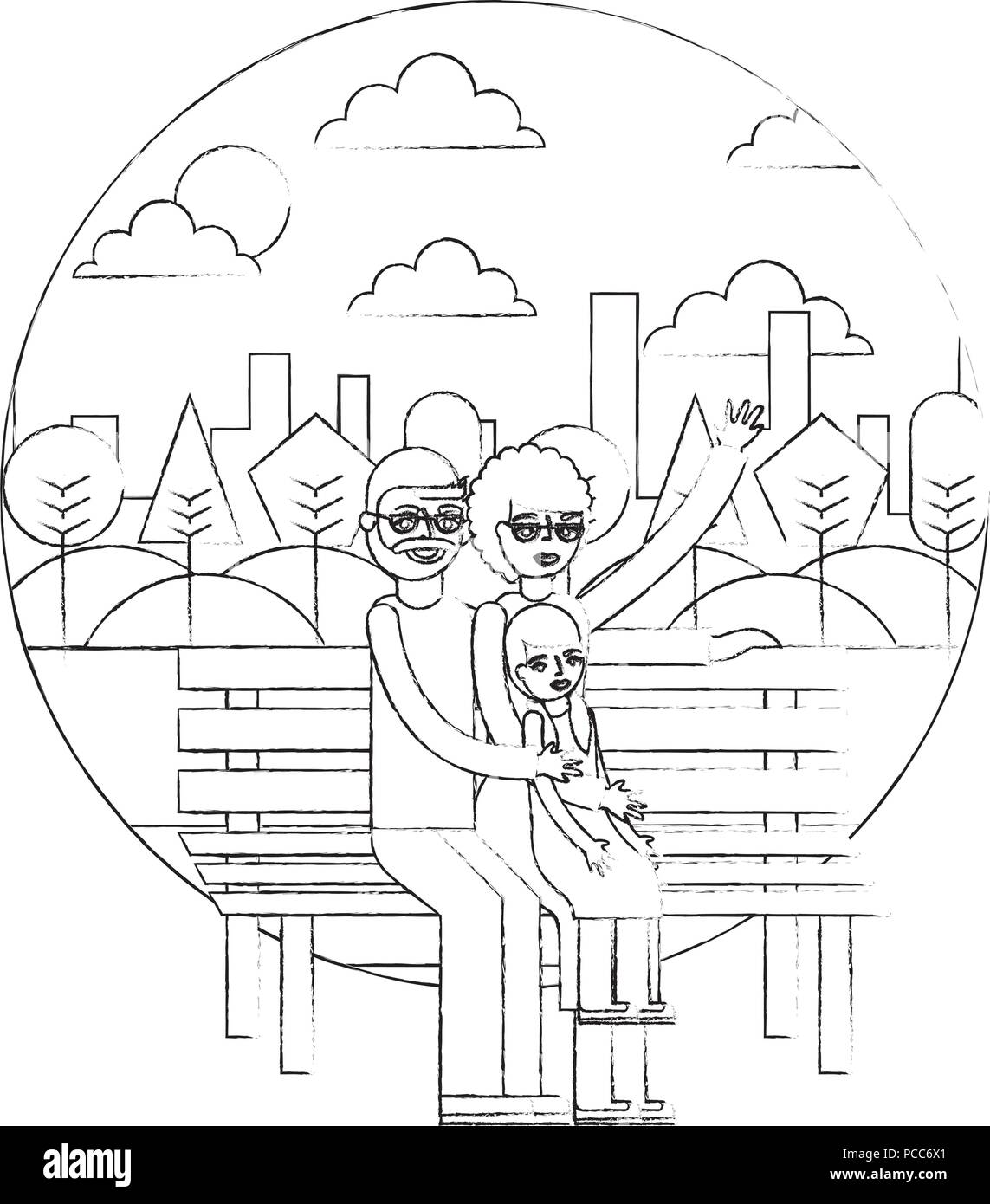 Grandparents With Granddaughter Sit In Park Bench Vector