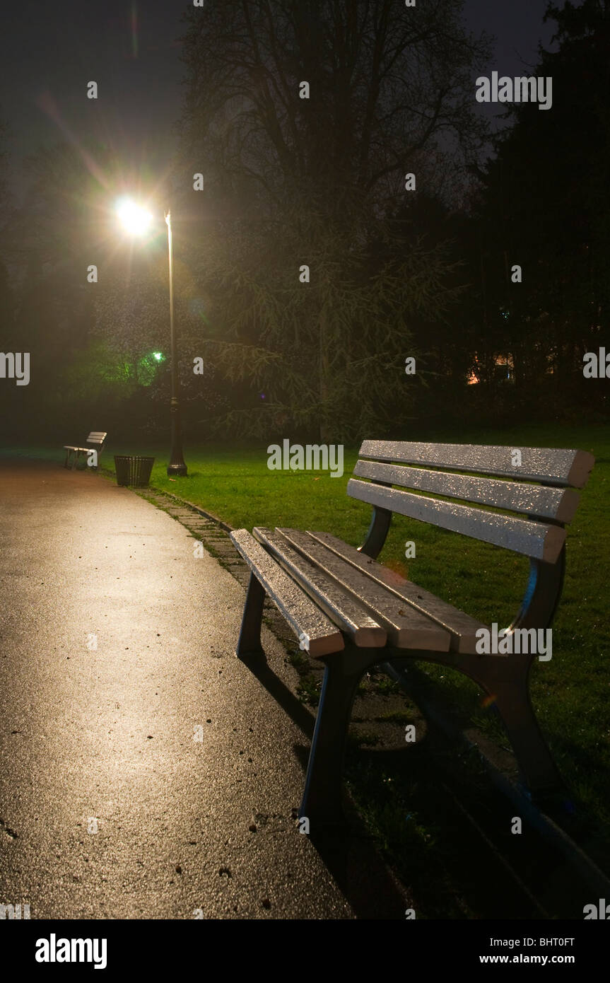 Empty Bench In City Park At Dark Autumn Night Paved Walkway Lit