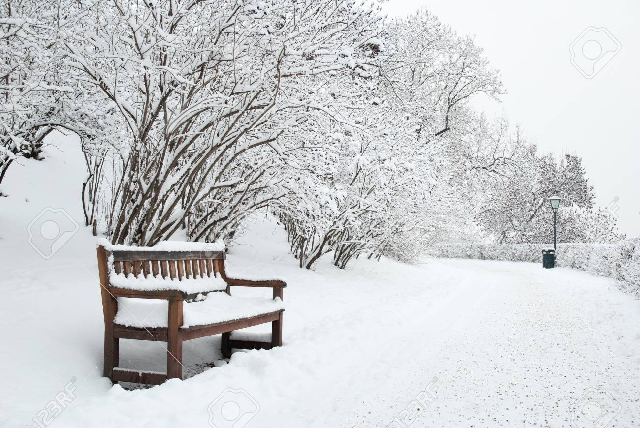Park Bench And Trees Covered By Heavy Snow Lots Of Snow Stock