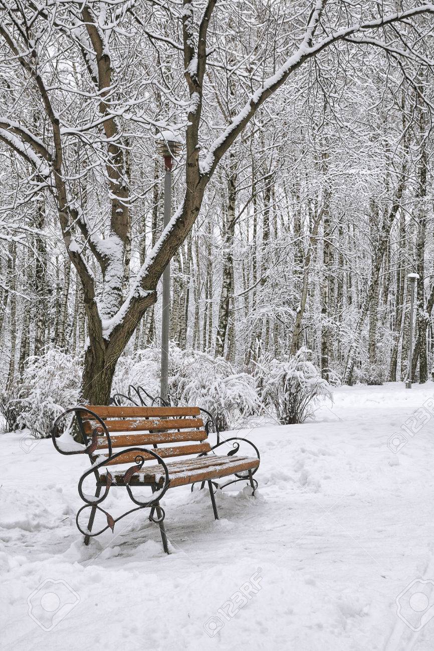 Old Empty Wooden Bench In Snow Covered Park Winter Background