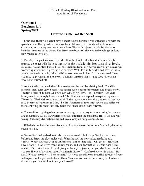 Question 1 Benchmark A Spring 2003 How The Turtle Got Her Shell