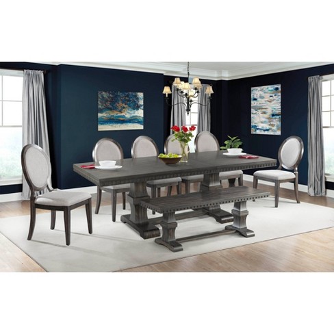 8pc Steele Dining Set Table 6 Round Fabric Chairs Bench Smokey