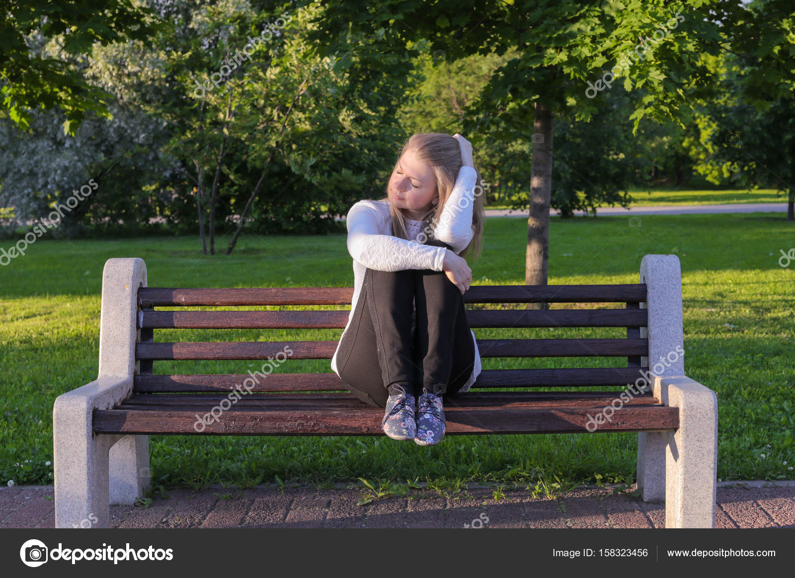 Sad Small Girl With Ten Years Old Sitting On A Bench Stock Photo