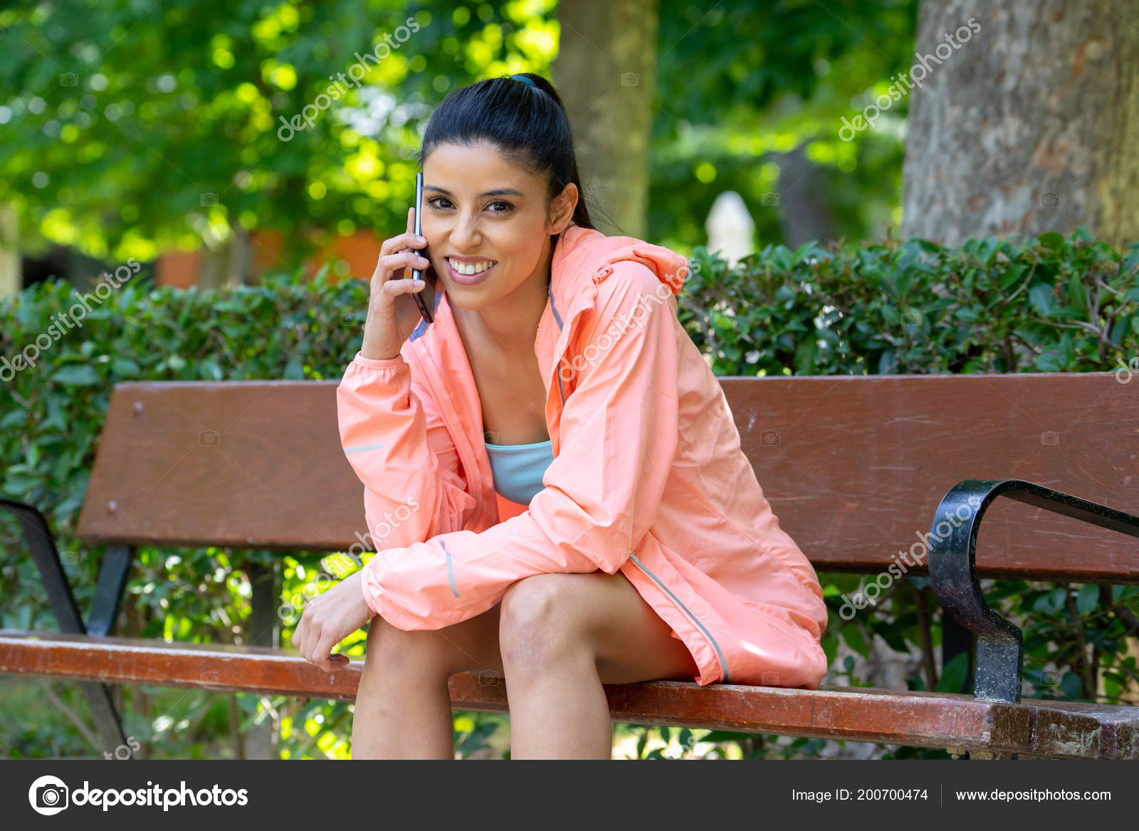 Pretty Latin Girl Using A Mobile Phone Sitting In A Bench In An