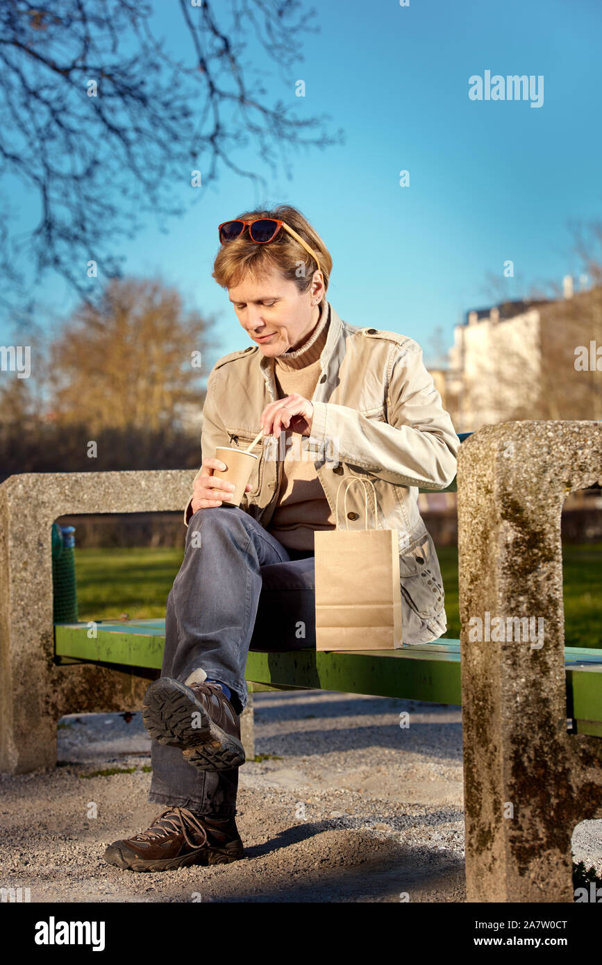 A Woman Seats On The Bench In A Park Enjoying In The Lunch Break