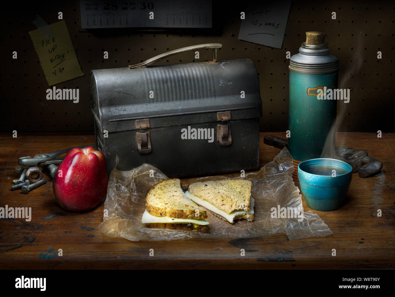 Still Life On Work Bench Featuring Old Lunch Box And Vacuum Bottle