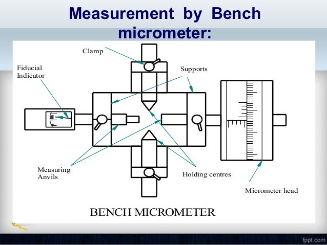 A micrometer sometimes known as a micrometer screw gauge is a device incorporating a calibrated screw widely used for accurate measurement of components in mechanical engineering and machining as well as most mechanical trades along with other metrological instruments such as dial vernier and digital calipers. The line diagram of bench micrometer is shown in figure. The instrument consists of a fiducial indicator measuring anvil and a micrometer head drum.
