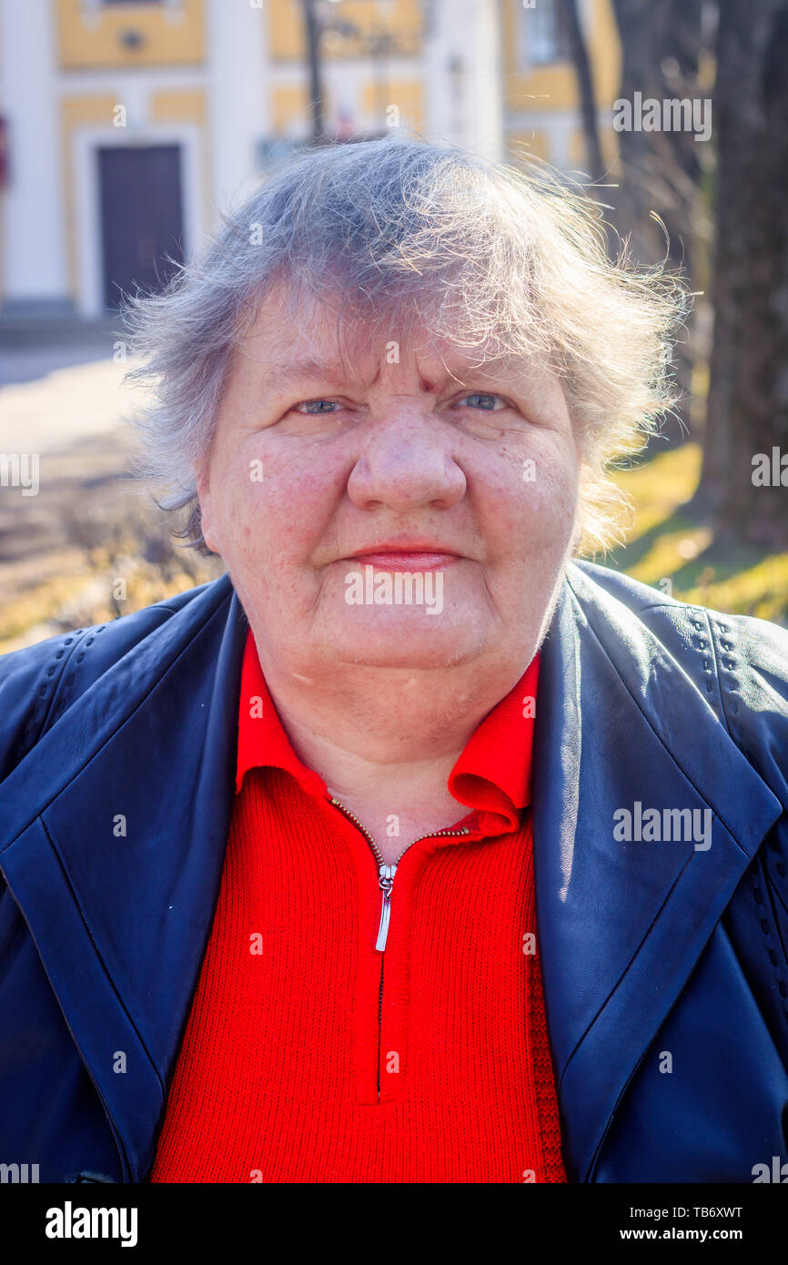 Elderly Woman On A Bench In The City Grandmother In A Red Sweater