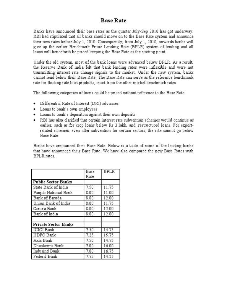 Base Rate Reserve Bank Of India Banks