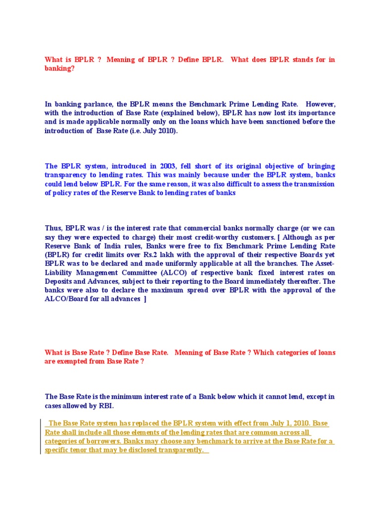 Bplr Benchmark Prime Lending Rate In Business Finance By