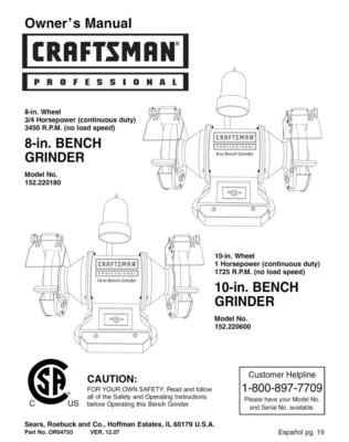 Craftsman 152 220180 152 220600 Bench Grinder Instruction Manual
