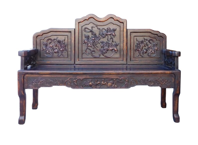 Chinese Distressed Brown Floral Foo Dogs Motif Double Seat Etsy