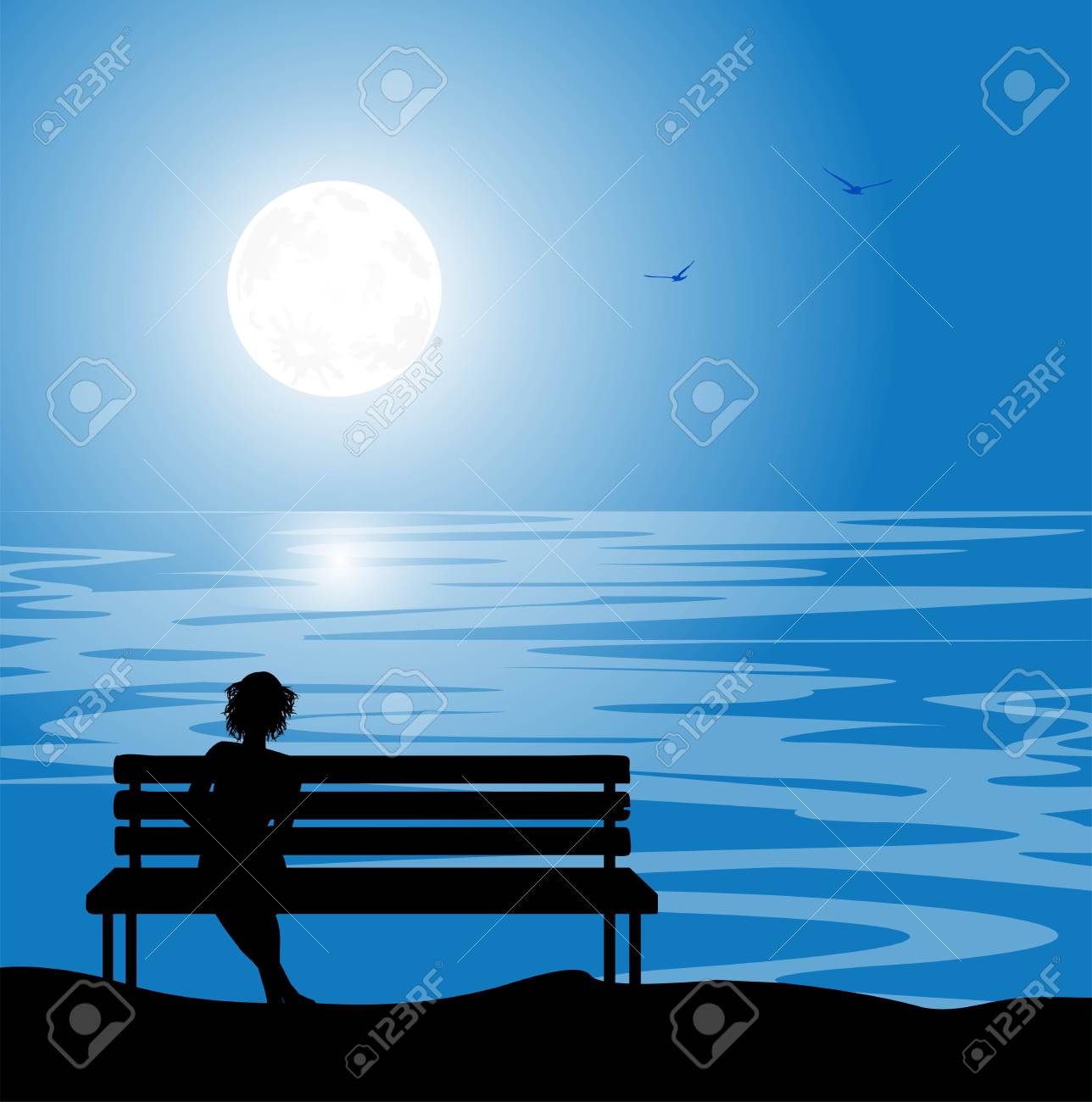Silhouette Of A Girl Sitting Lonely In The Moonlight Design For