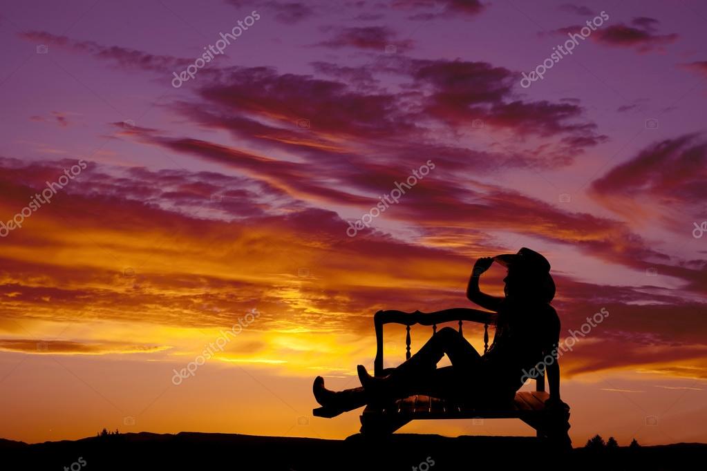 Western Girl On Bench With Hat Silhouette Stock Photo