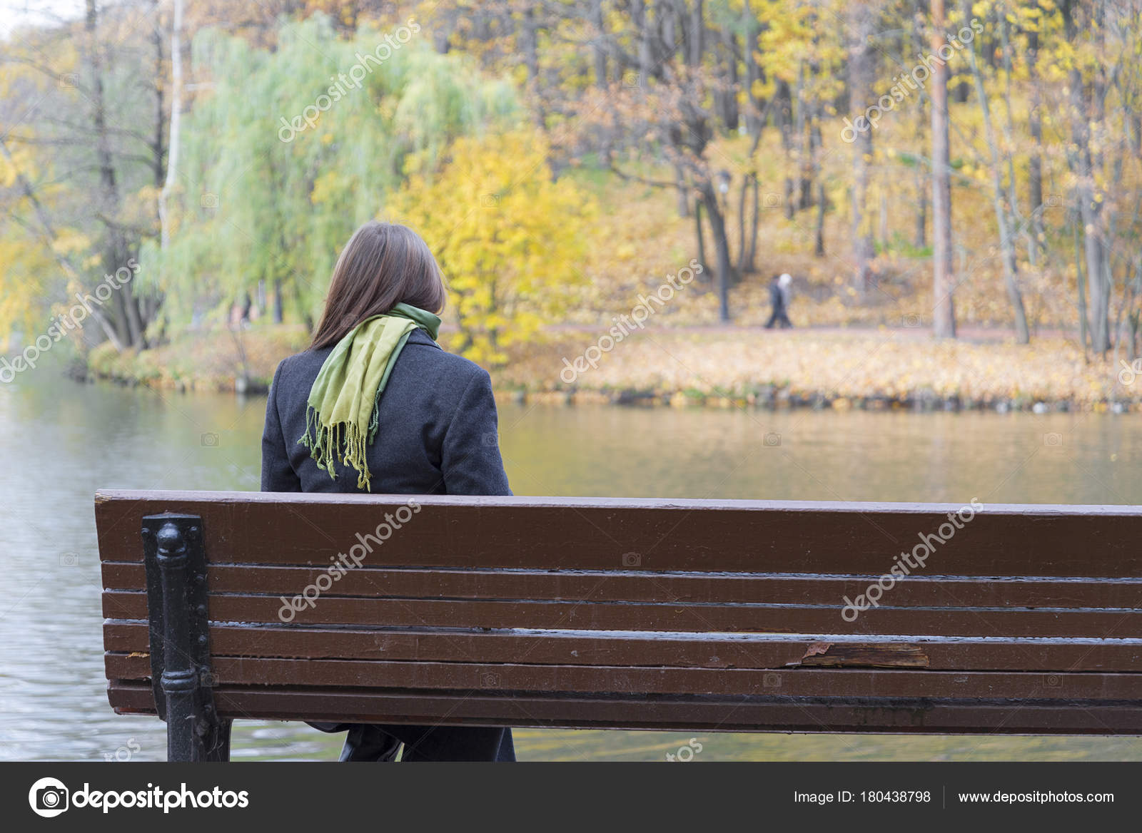 Girl Sitting Alone On A Bench In Autumn Day Stock Photo