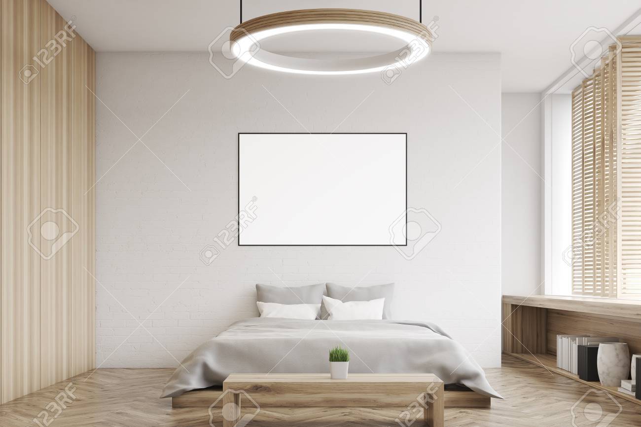 Front View Of A Bedroom With A Round Lamp A Large Bed A