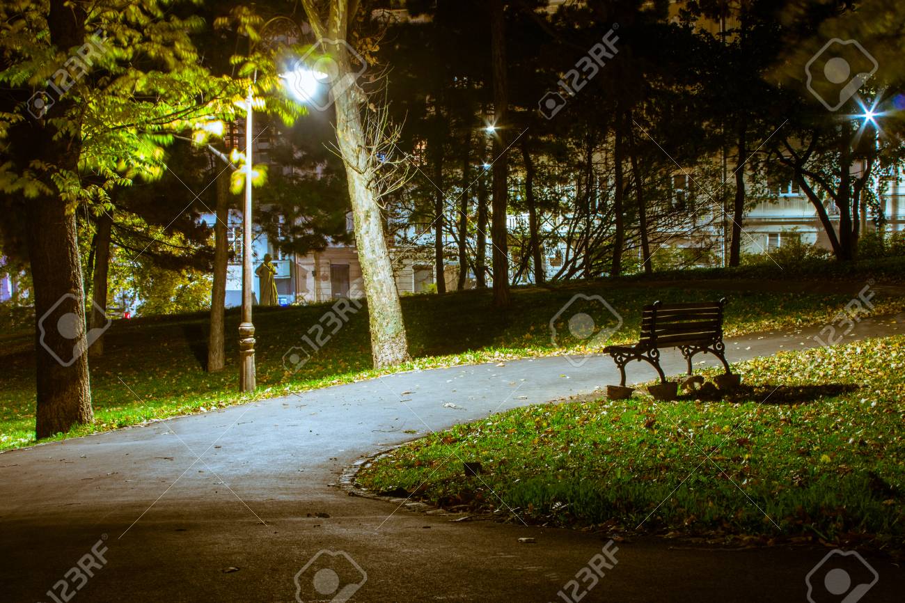 The Bench In The Autumn Park In Belgrade At Night Serbia Stock