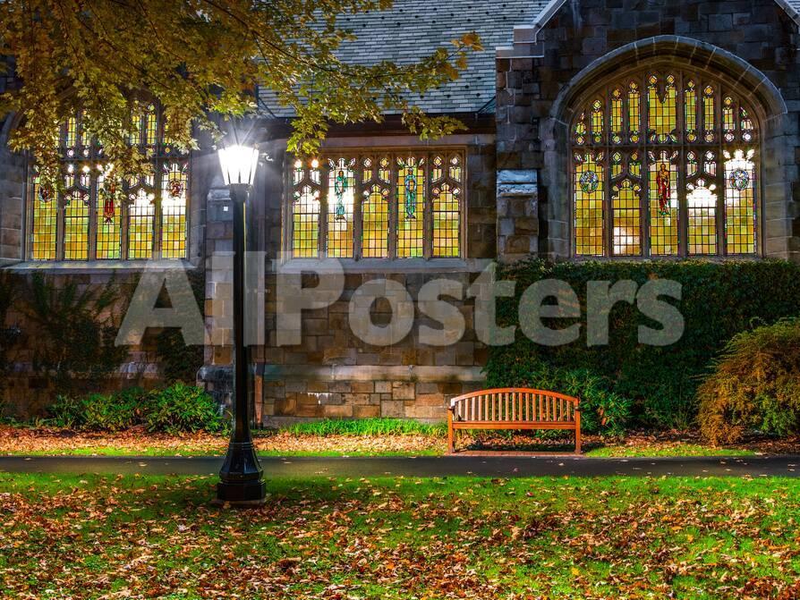 A Bench Outside A Row Of Colorful Stained Glass Windows In The