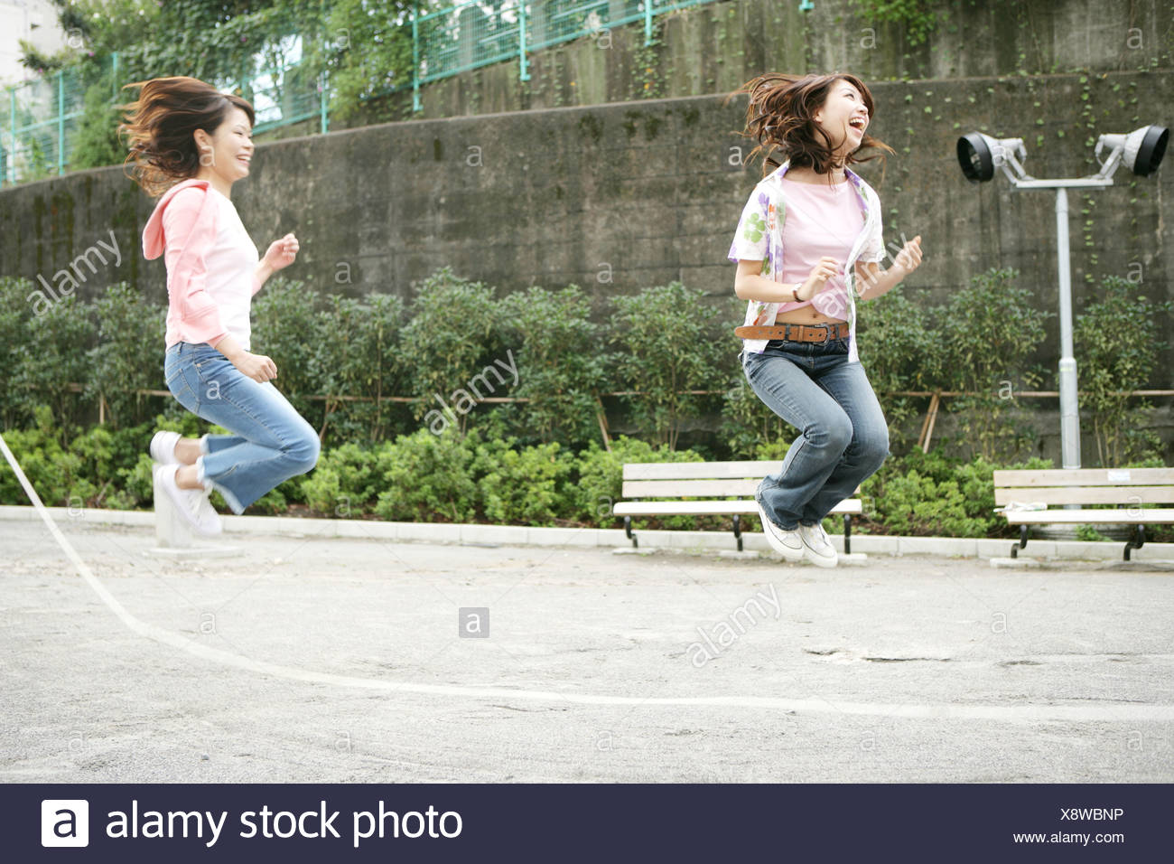 Side Profile Of Two Young Women Jumping On A Jump Rope Stock Photo