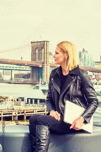 Cute Happy Girl With Long Blonde Hair In Leather Jacket