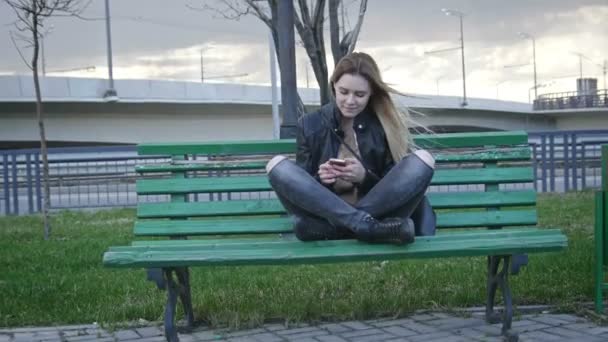 Beautiful Woman Portrait Sitting On Bench While Wearing Leather