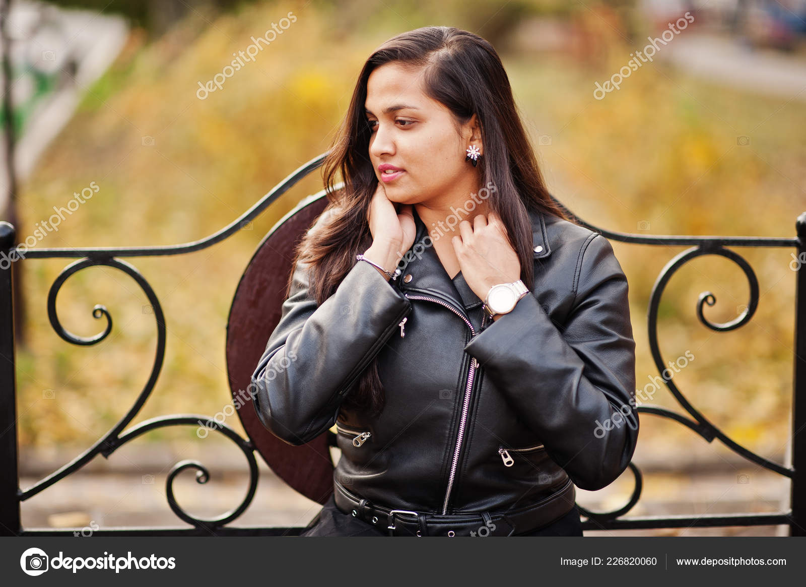 Pretty Indian Girl Black Saree Dress Leather Jacket Posed Outdoor