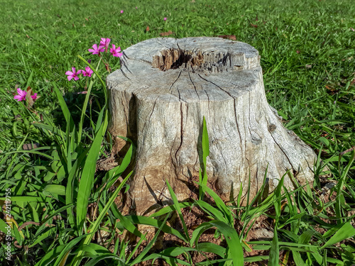A Bench In The Park Made Of A Dry And Cut Tree Stump Rooted On A