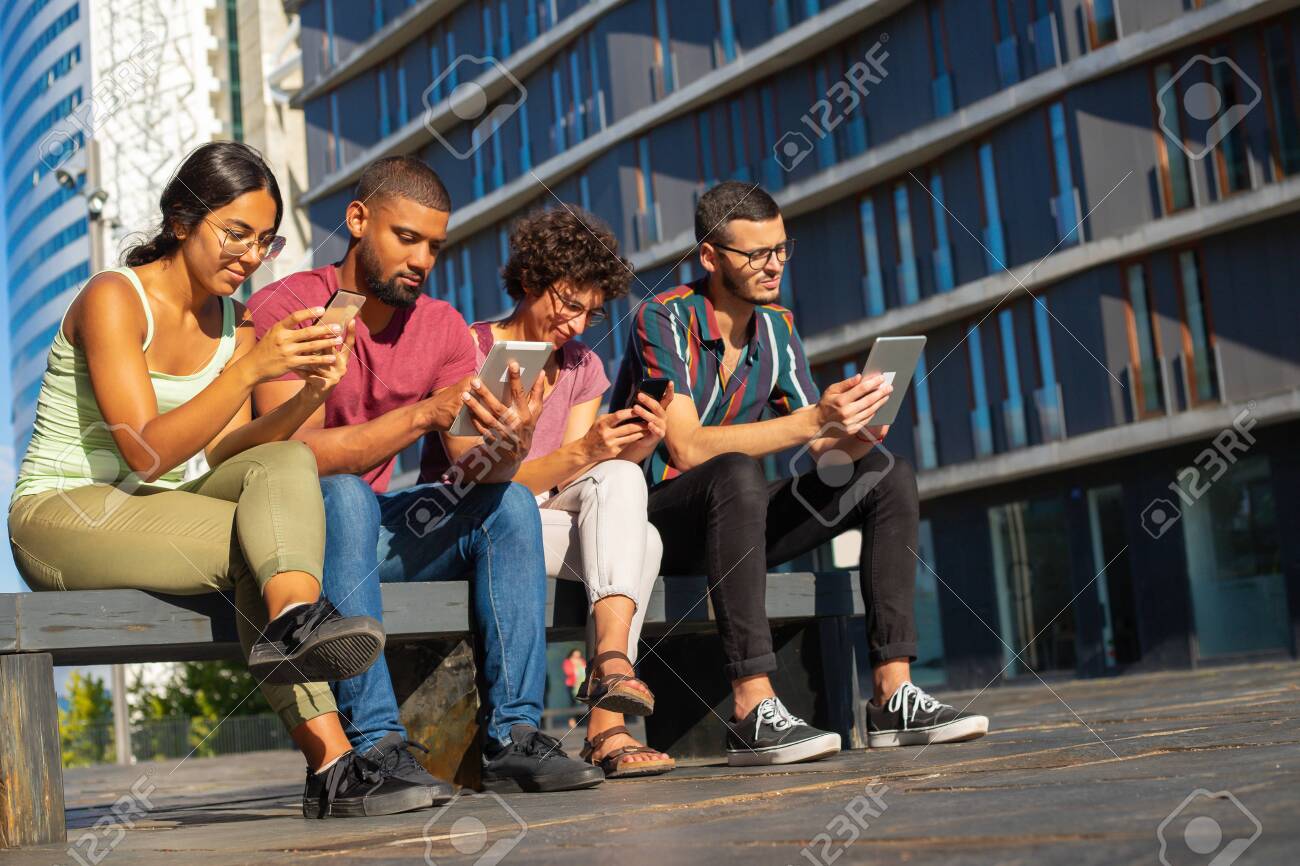 Happy Young Mix Raced Men And Women Sitting On Bench Outside