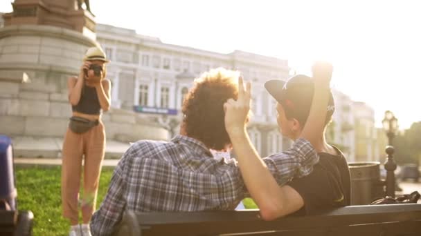 Girl Taking Pictures Of Her Friends Sitting On Bench In City Park