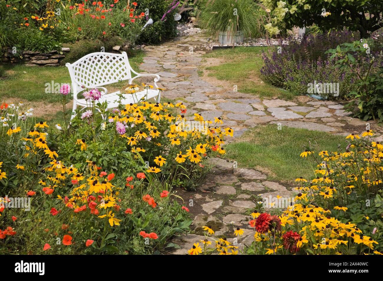 Flagstone Paths Bench And Borders With Yellow Rudbeckia Indian