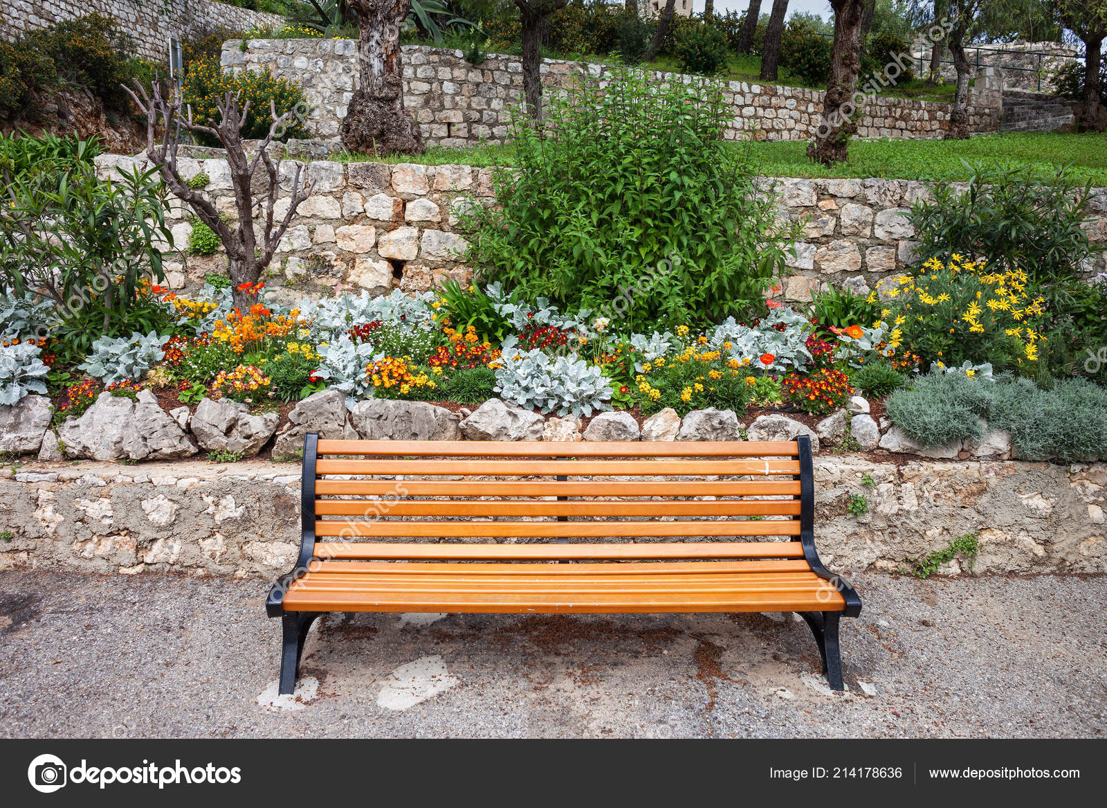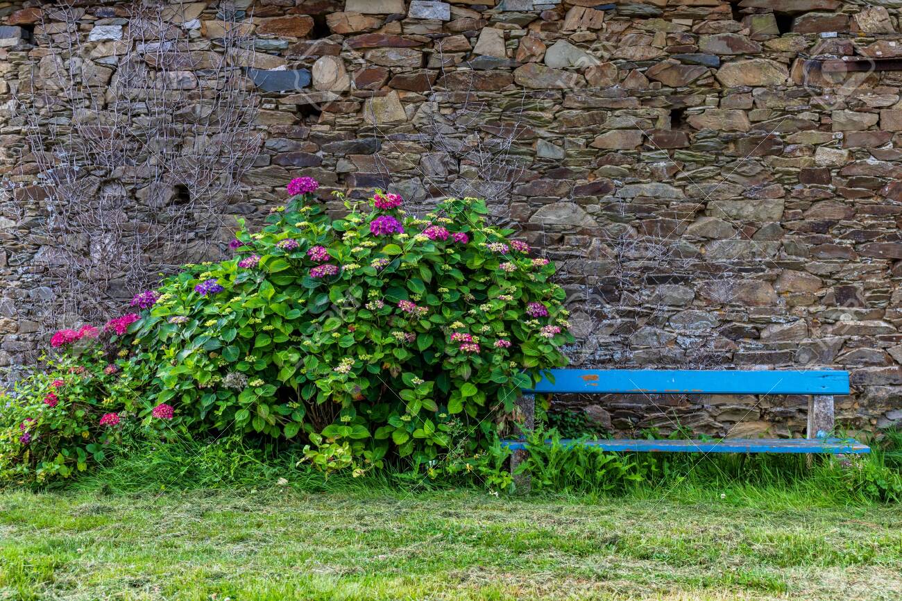 Bench With Flowers With Stone Wall Background Stock Photo Picture