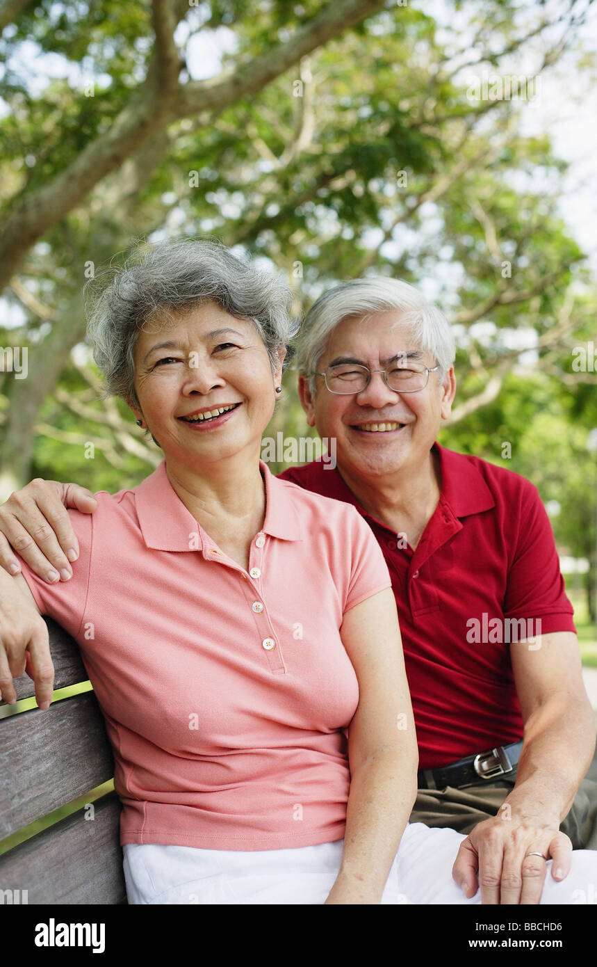 Mature Couple On Park Bench Looking At Camera Stock Photo