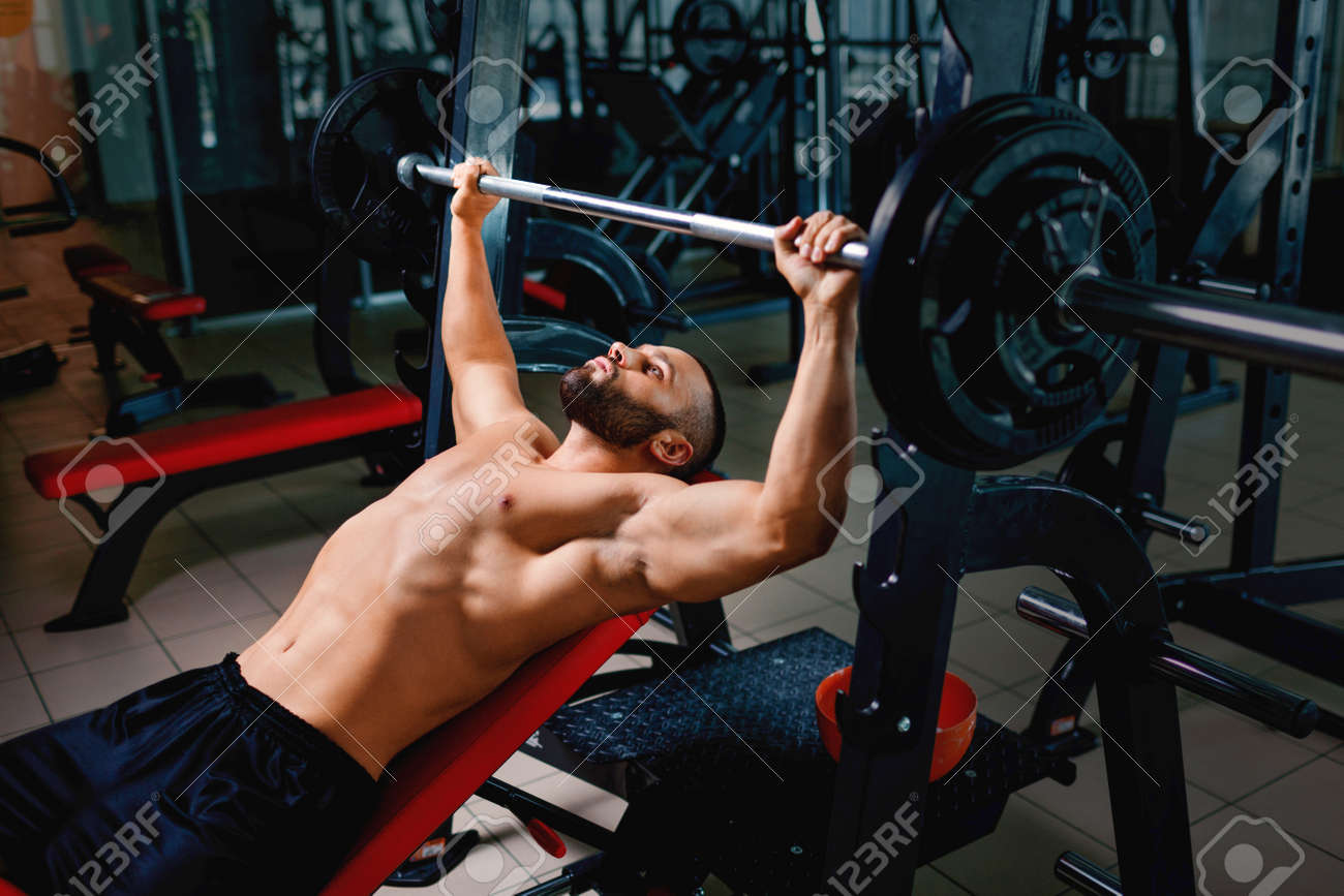 An Attractive Man With A Muscular Body Performs A Bench Press