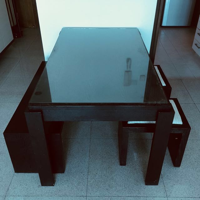 Dark Brown Wooden Dining Table With Tempered Glass Surface With 1