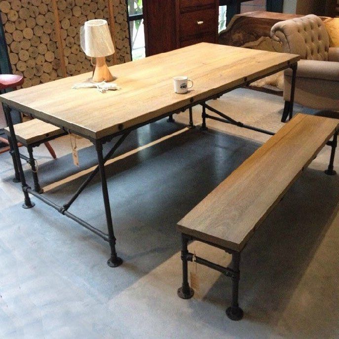 Po Industrial Loft Pipe Solid Wood Dining Table 2 Bench