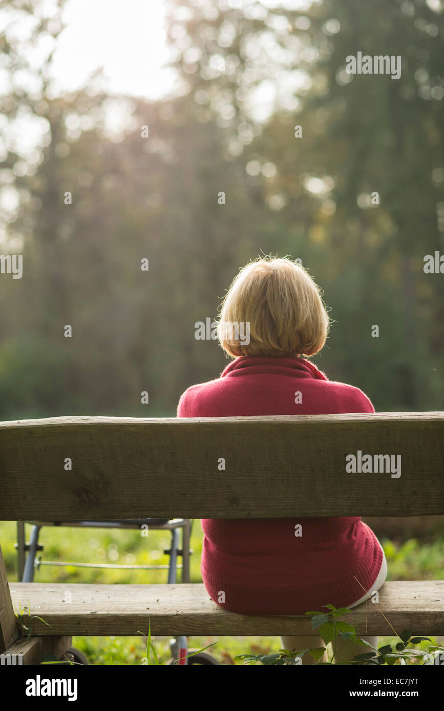Senior Woman Sitting On A Park Bench Back View Stock Photo