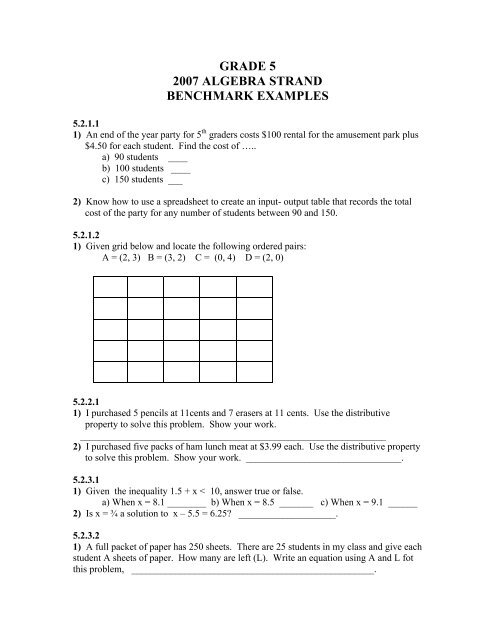 Grade 5 2007 Algebra Strand Benchmark Examples